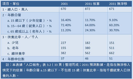 「外來人口政策」的基調,是接納來自中國大陸的「新移民」,以緩解人口的老化,提高就業人口(15—64歲)對老人的扶養(供養)系數。「人口報告」33頁稱:65歲以上長者佔全港人口比例的預測,由2001的11%「大幅增加」至2031的24%。