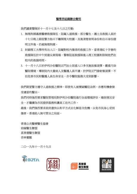 近幾日街頭的和平請願,始於中環的「午膳行街」(或稱「和你lunch(午餐)」)。參與的西裝客、白領人和外籍人士,聲援被圍困的理大學生,呼籲官方以和平方式處置校園衝突;其口號是:「救學生,救Poly(Polytechnic的簡稱)」。