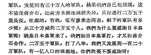 「傳達面」如此寬,足證毛的「謝皇軍」說,不是外交場合的開玩笑,而是闡述「槍桿子出政權」的「戰略思想」。 |